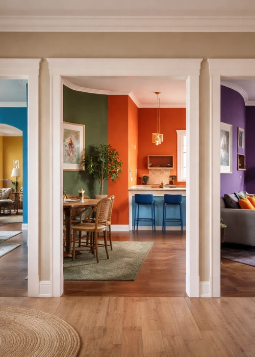 From the entryway, you shouldn’t be able to see four different wall colors. The walls are the backdrop. Let the layers do the talking.